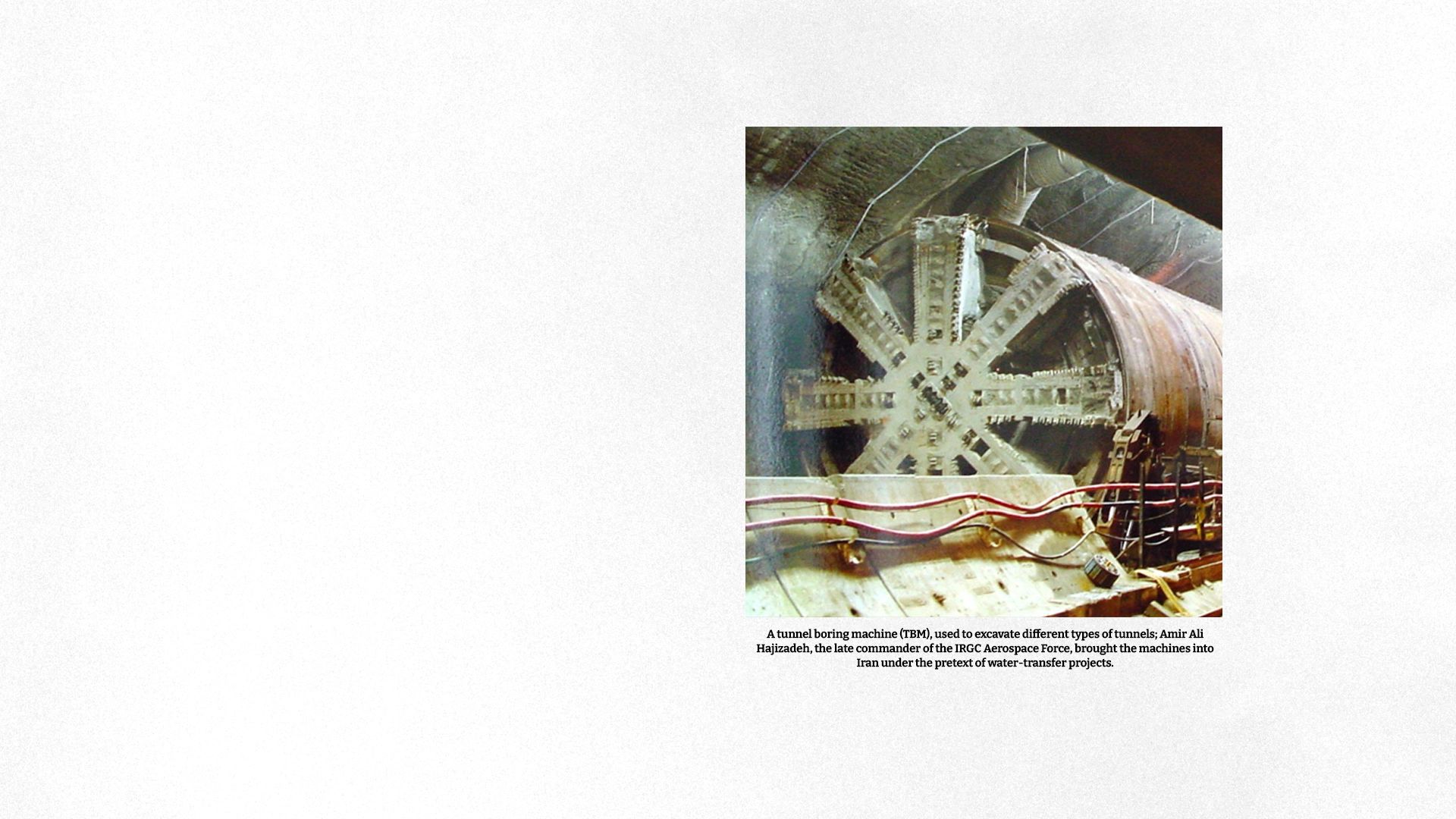 Hajizadeh also oversaw large parts of the expansion of the Tehran Metro during the years it was run by Mohsen Hashemi, son of former president Akbar Hashemi Rafsanjani. During that period, giant TBM tunneling machines were imported under the pretext of metro construction, and technicians were sent abroad for training. In the context of this investigation, that detail matters because it links water-transfer tunnels, urban infrastructure, and the engineering capacities that also served the security state.