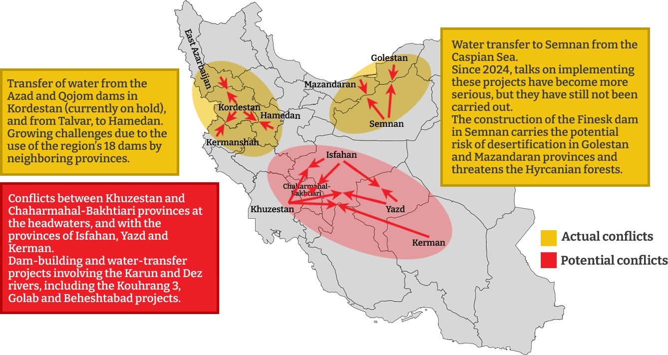 The result is a chain of tension stretching from the headwaters in Chaharmahal and Bakhtiari to Isfahan in the center, then onward to Yazd and Kerman, which receive transferred water, and to Khuzestan, which fears losing flows downstream.