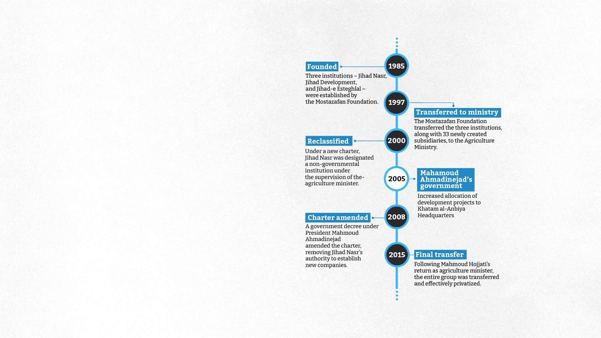 Jihad Nasr was more closely aligned with the Islamic Republic’s reformist camp and was strongly backed by Mahmoud Hojjati, the long-serving agriculture minister under Mohammad Khatami and later Hassan Rouhani. Some observers, including Karami, believe one reason former president Mahmoud Ahmadinejad allowed Khatam al-Anbiya to expand so aggressively was to weaken Jihad Nasr’s position.