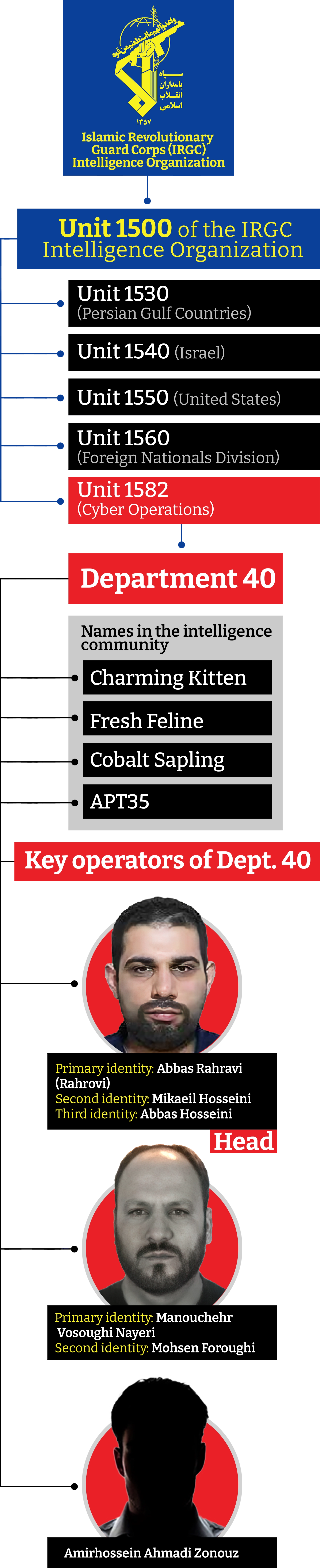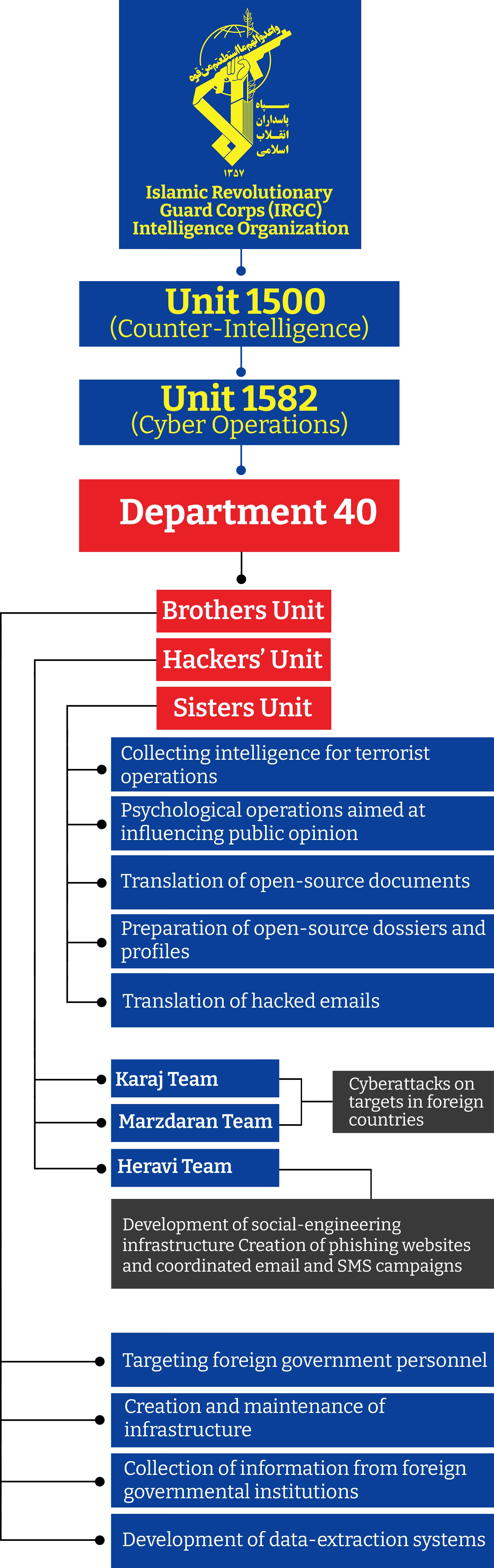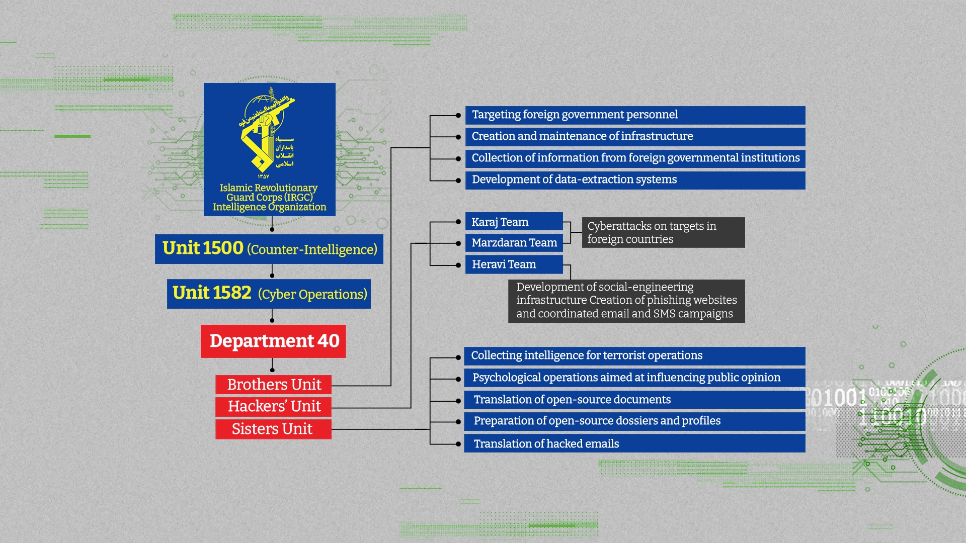 The unit operates as a department under Unit 1582, the cyber-operations bureau, which is itself a subdivision of Unit 1500 of the IRGC Intelligence Organization.