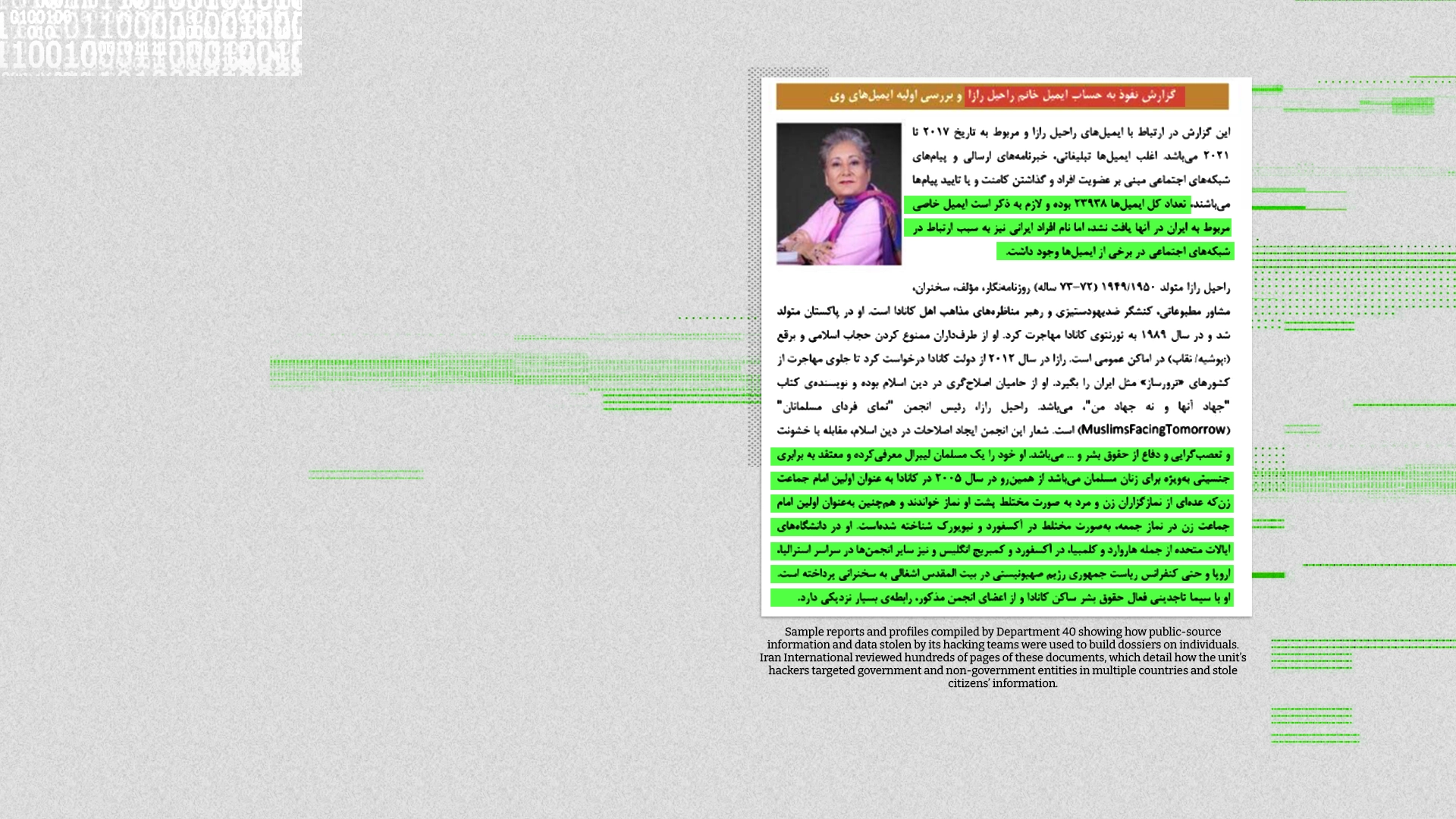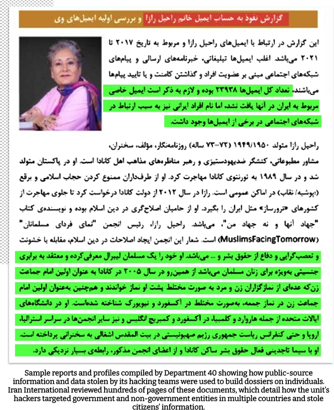 Department 40 compiled profiles on non-Iranian citizens and Iranian dual nationals, with documents describing attempts to access the email accounts of some of the targeted individuals, though whether the efforts succeeded is unclear.