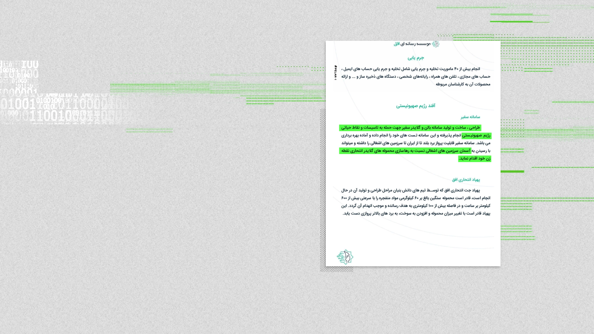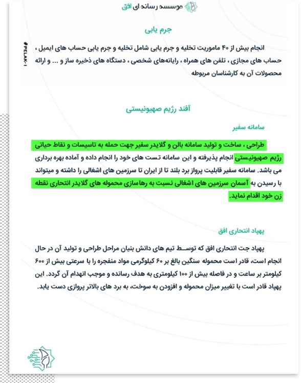 Another Department 40 project, code-named Ofogh, or horizon aimed to manufacture a jet-powered suicide drone capable of carrying 60 kilograms of explosives to attack targets in Israel.
