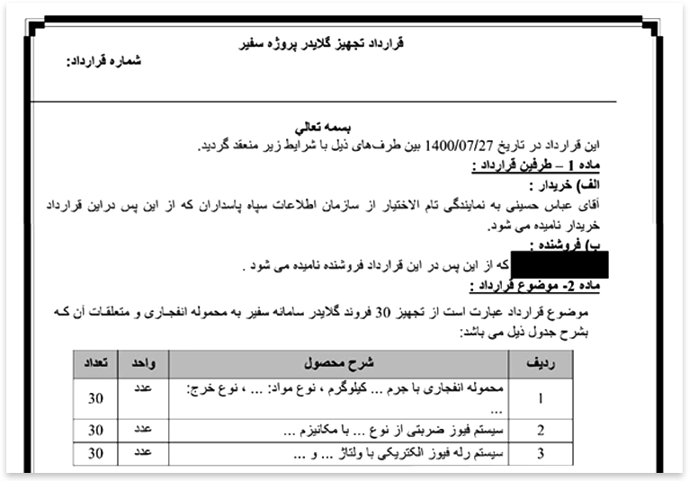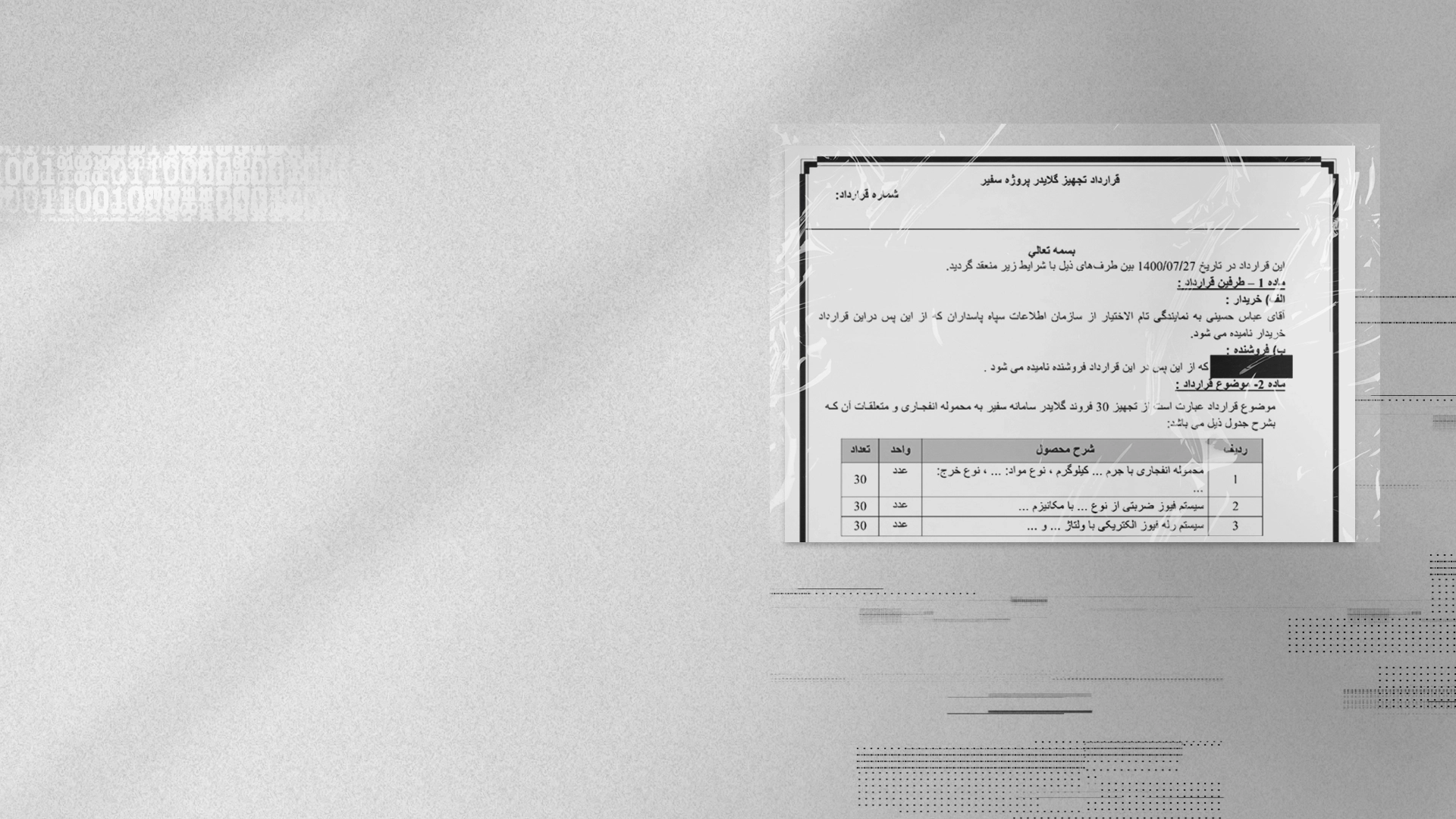 Materials reviewed by Iran International include a video of a drone test, as well as a contract for supplying equipment for the Safir explosive drone. Rahrovi signed the contract under the alias Abbas Hosseini.