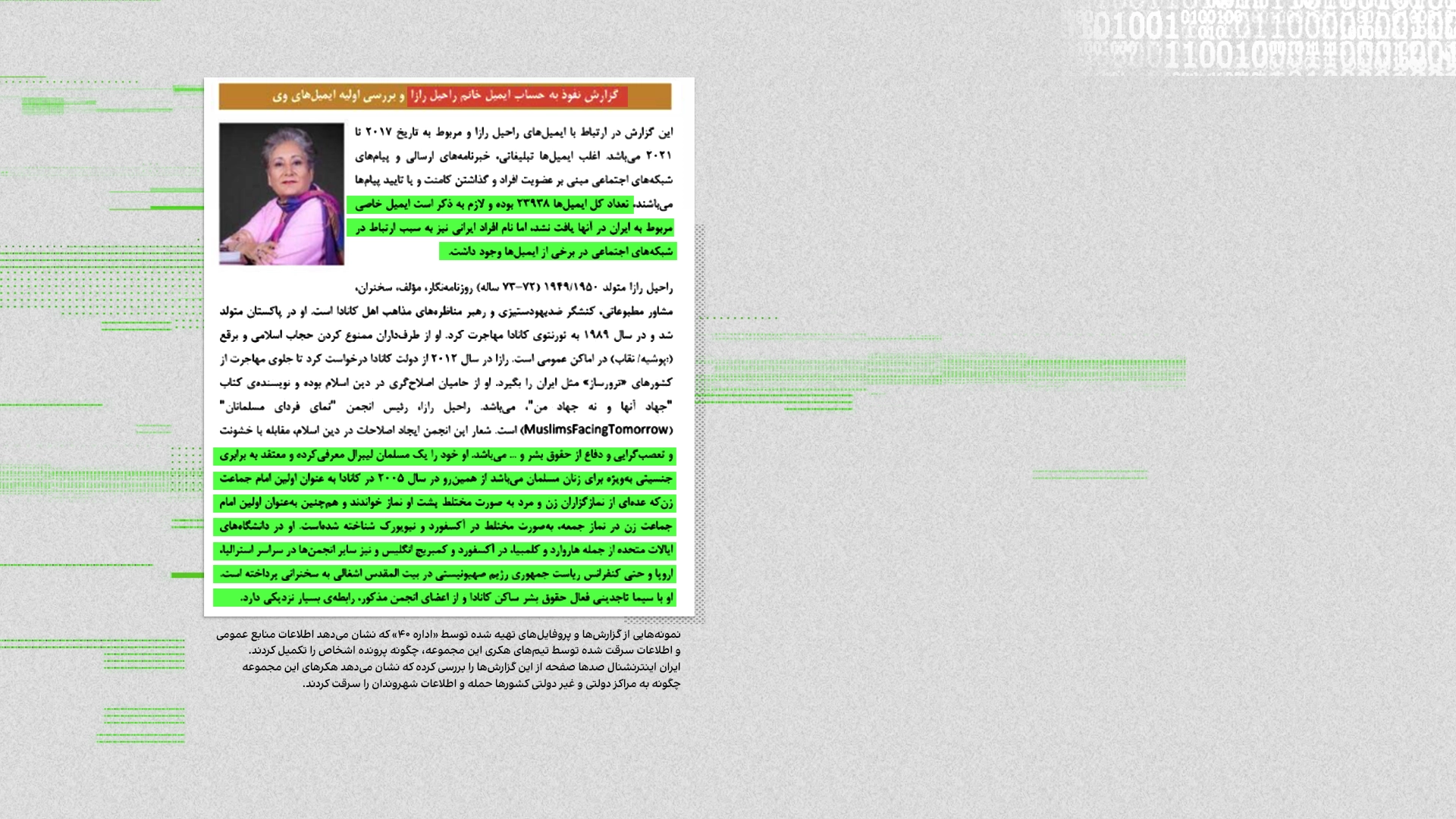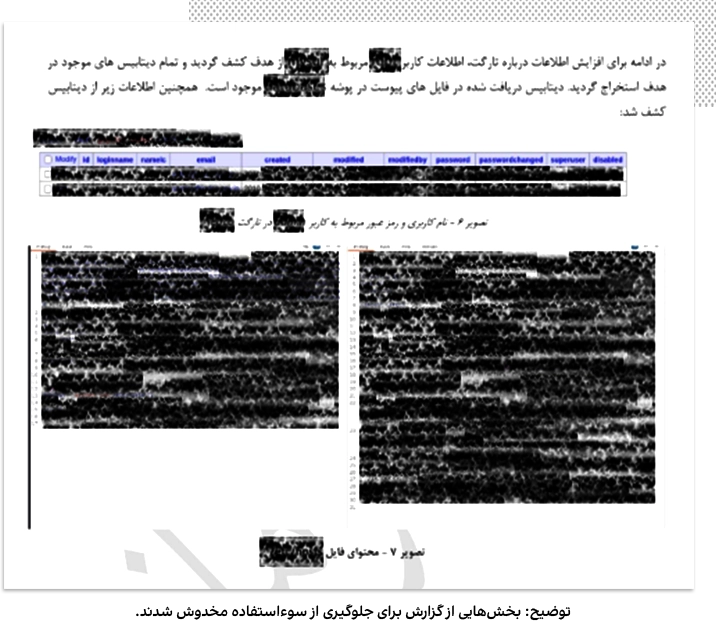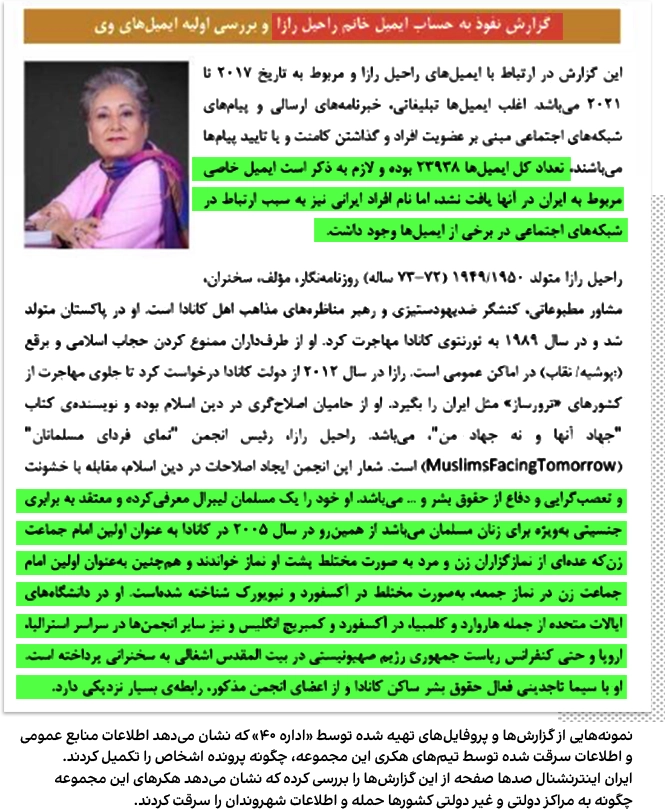 یکی از گزارشهای اداره ۴۰ که ایراناینترنشنال مشاهده کرده، مربوط به هک ایمیلهای یک شهروند غیر ایرانی است. در این گزارش، نویسنده ضمن توضیح ایمیلهای موجود در میلباکس قربانی، برای مقامات بالاتر توضیح داده چه تعداد از ایمیلها مربوط به اشخاص ایرانی یا دوتابعیتی بودند و چطور این اشخاص میتوانند اهداف جدید سازمان باشند.