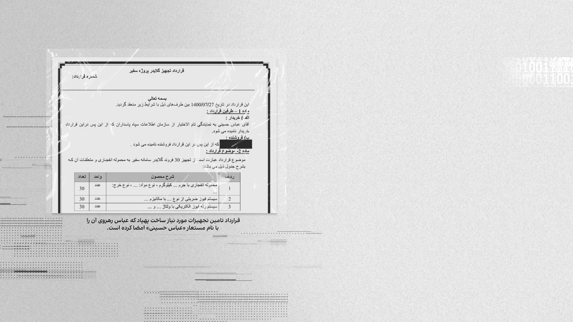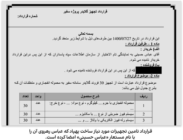 در اسنادی که ایراناینترنشنال مشاهده کرده، ویدیوی تست یک پهپاد وجود دارد. همچنین قراردادی برای تامین تجهیزات پهپاد انفجاری سفیر بسته شده است. رهروی این قرارداد را با هویت «عباس حسینی» امضا کرده کرده است.