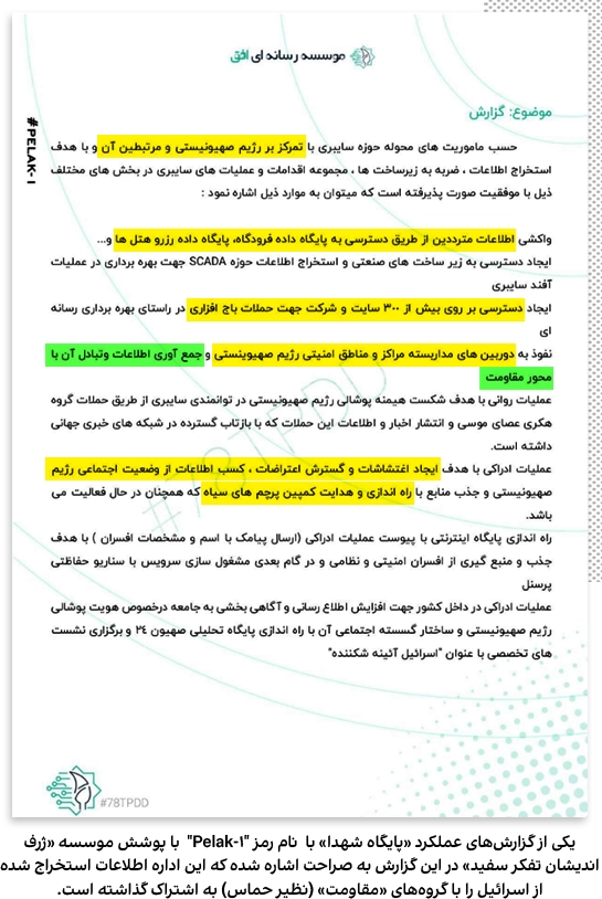 - طراحی عملیات سایبری با هدف ایجاد نارضایتی و آشوب در اسرائیل، همچنین «مختل» کردن زندگی شهرکنشینان