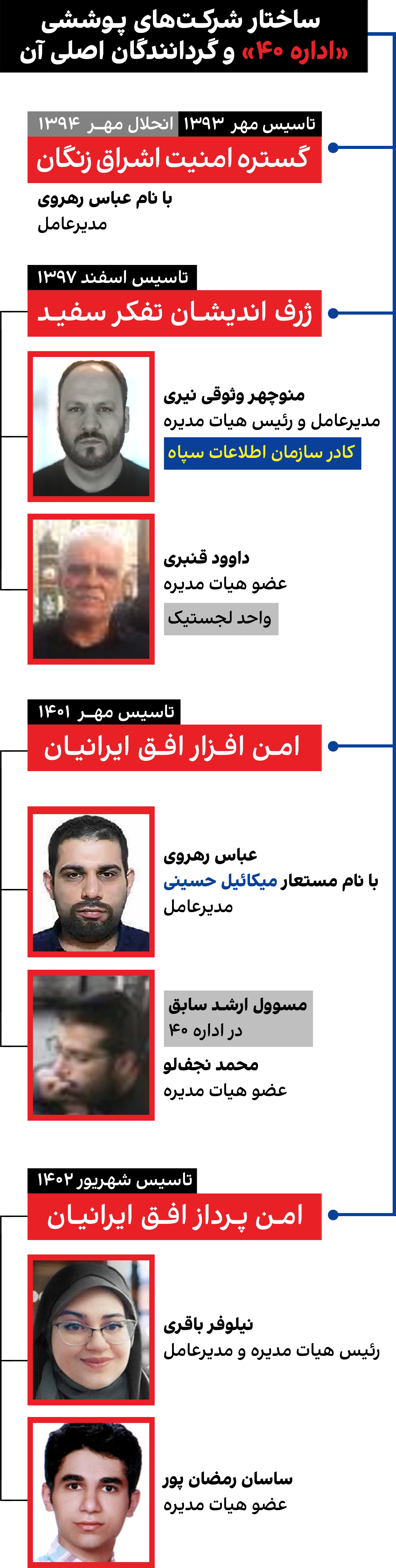 ایراناینترنشنال برای اولینبار اسامی و مشخصات اداره ۴۰ را منتشر میکند. علاوهبر رهروی و همسرش باقری، روابط فامیلی بیشتری در این شبکه از کارکنان وجود دارد. بررسیهای ایراناینترنشنال نشان میدهد لیلا شریفی، عضو واحد «خواهران» خواهر مهدی شریفی، رهبر گروه هکرهای اداره ۴۰ است. همچنین نرگس و عطیه ندافی نیز که در بخش «خواهران» فعالیت میکنند خواهرند.