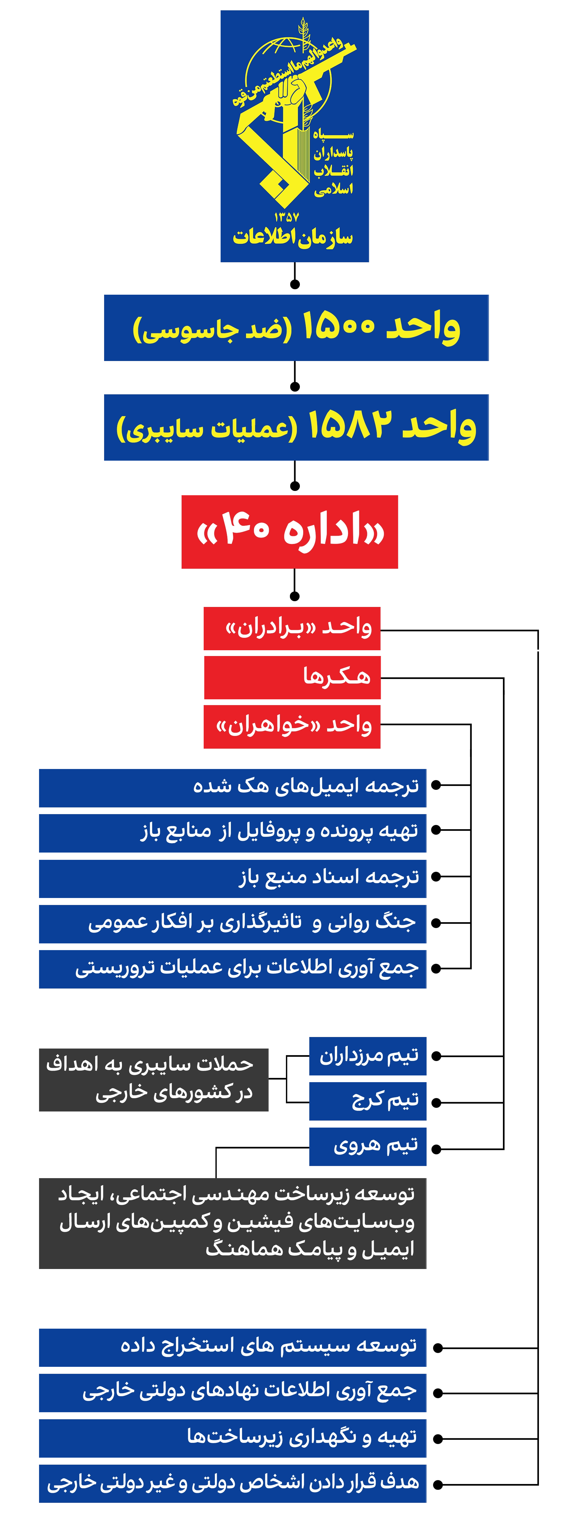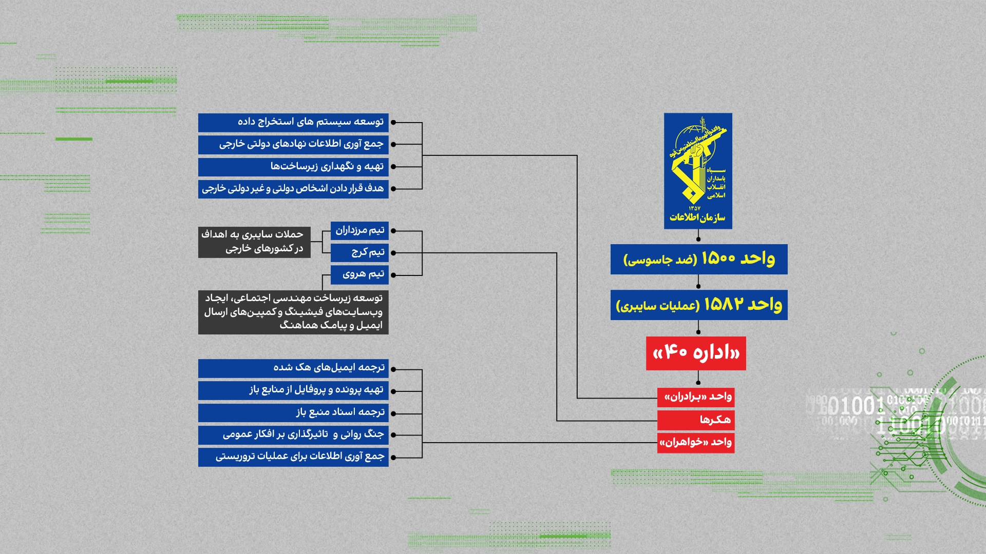 این واحد، دپارتمانی زیر نظر «واحد ۱۵۸۲» (مخصوص عملیات سایبری) از زیرمجموعههای واحد ۱۵۰۰ سازمان اطلاعات سپاه است.