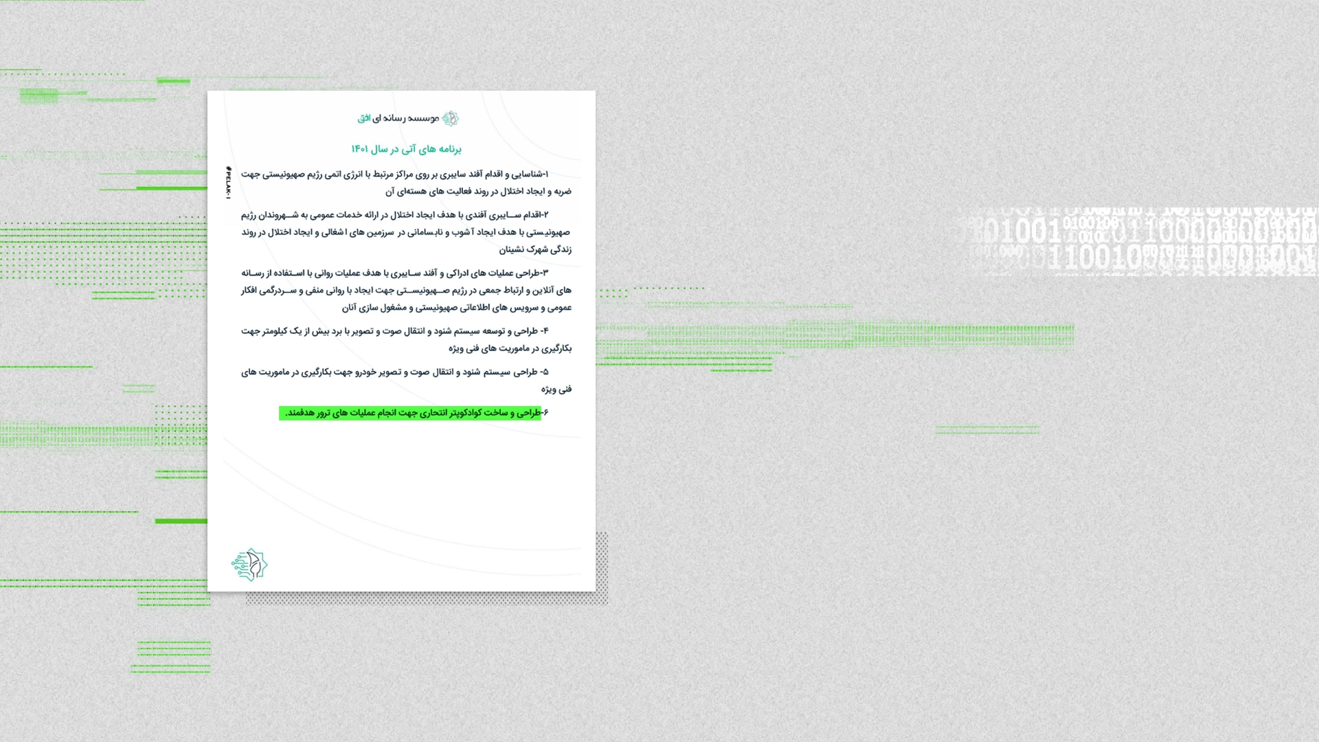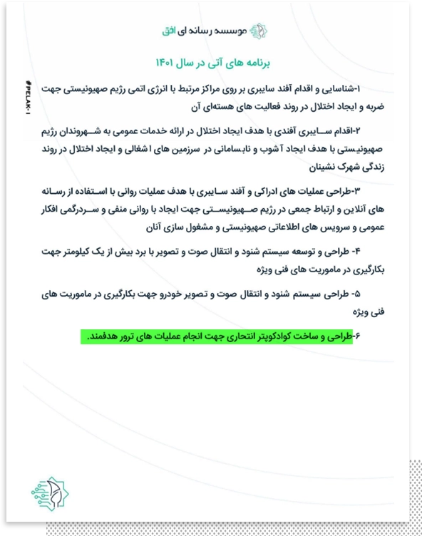 - طراحی و ساخت و کوادکوپتر انتحاری جهت انجام عملیاتهایی که به صراحت در گزارش «ترور» عنوان شده است