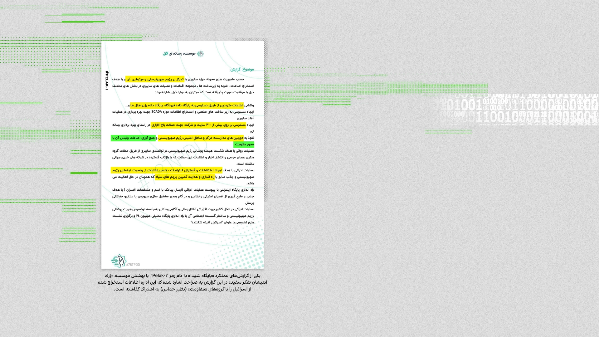 جمهوری اسلامی همواره به همکاری و دستکم زمینهسازی حملات ۷ اکتبر از سوی حماس و جهاد اسلامی، متهم شده است. اسنادی که اکنون درز کرده و ایراناینترنشنال آنها را مشاهده کرده، تایید میکند مجموعه بهطور خاص در سال ۱۴۰۱ اقداماتی را برنامهریزی کرده که میتواند با حملات ۷ اکتبر مرتبط باشد. آنها در گزارشهای خود نوشتند اطلاعات حاصل از جاسوسی از اسرائیل را با گروههای «مقاومت» به اشتراک گذاشتند.