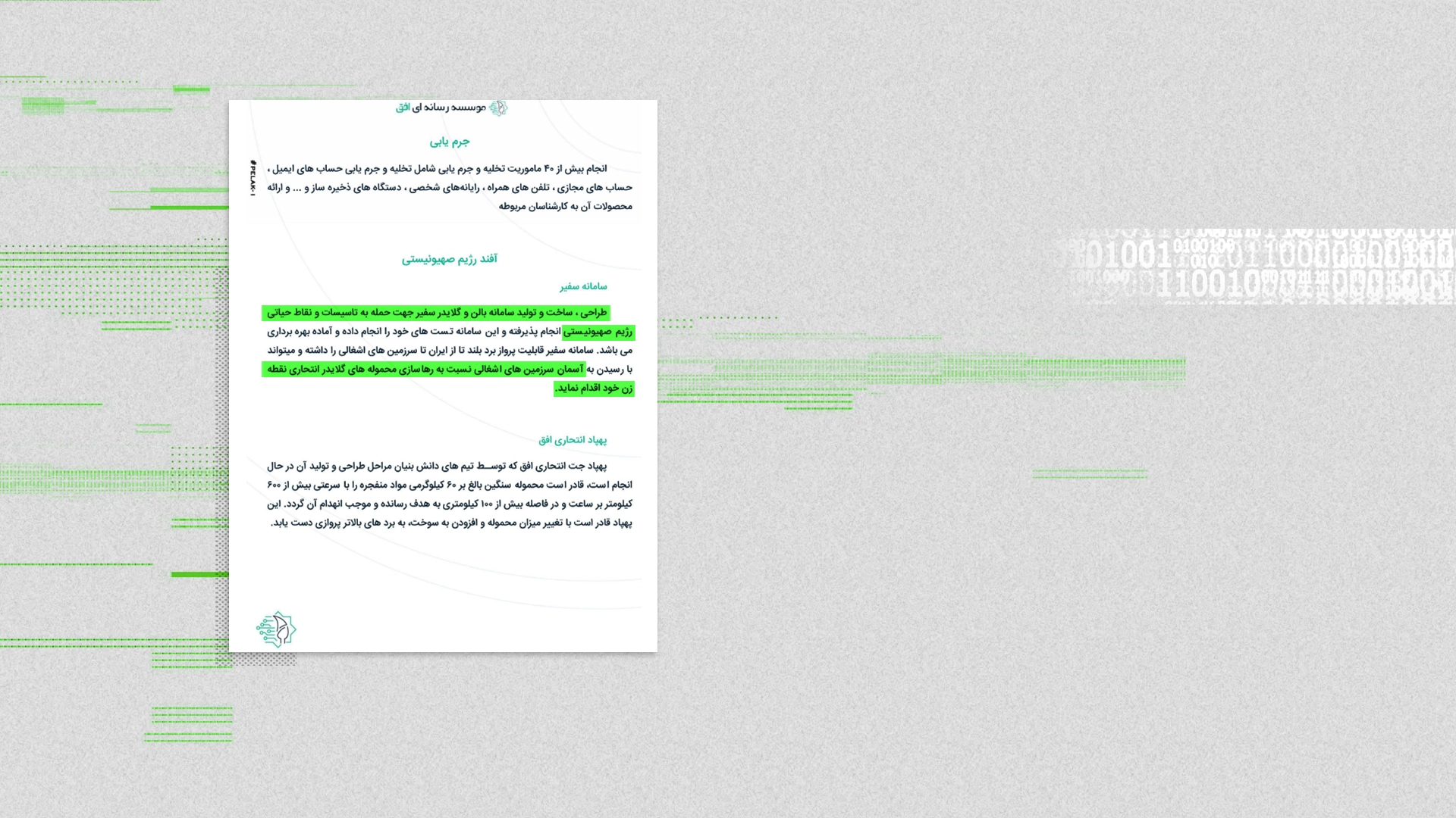 ویدیوی آزمایش یک پهپاد انفجاری مرتبط با اداره ۴۰ که برای مشاهده مقامات سازمان اطلاعات سپاه تهیه شده است.